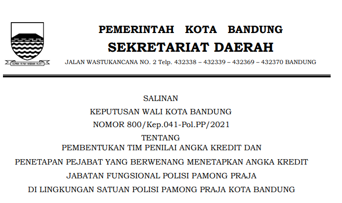 Keputusan Wali Kota Bandung Nomor 800/Kep.041-Pol.PP/2021 tentang Pembentukan Tim Penilai Angka Kredit Dan Penetapan Pejabat Yang Berwenang Menetapkan Angka Kredit Jabatan Fungsional Polisi Pamong Praja Di Lingkungan Satuan Polisi Pamong Praja Kota Bandung |